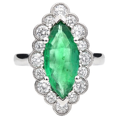 - > Natural Emerald 2.51ct & Diamond 0.96ct Marquise Shaped Cluster Ring