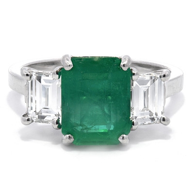 A brand-new, unused, certified platinum natural diamond & emerald gemstone three-stone cluster ring, set with one emerald-cut emerald gemstone at the centre & two radiant-cut diamonds to the sides.