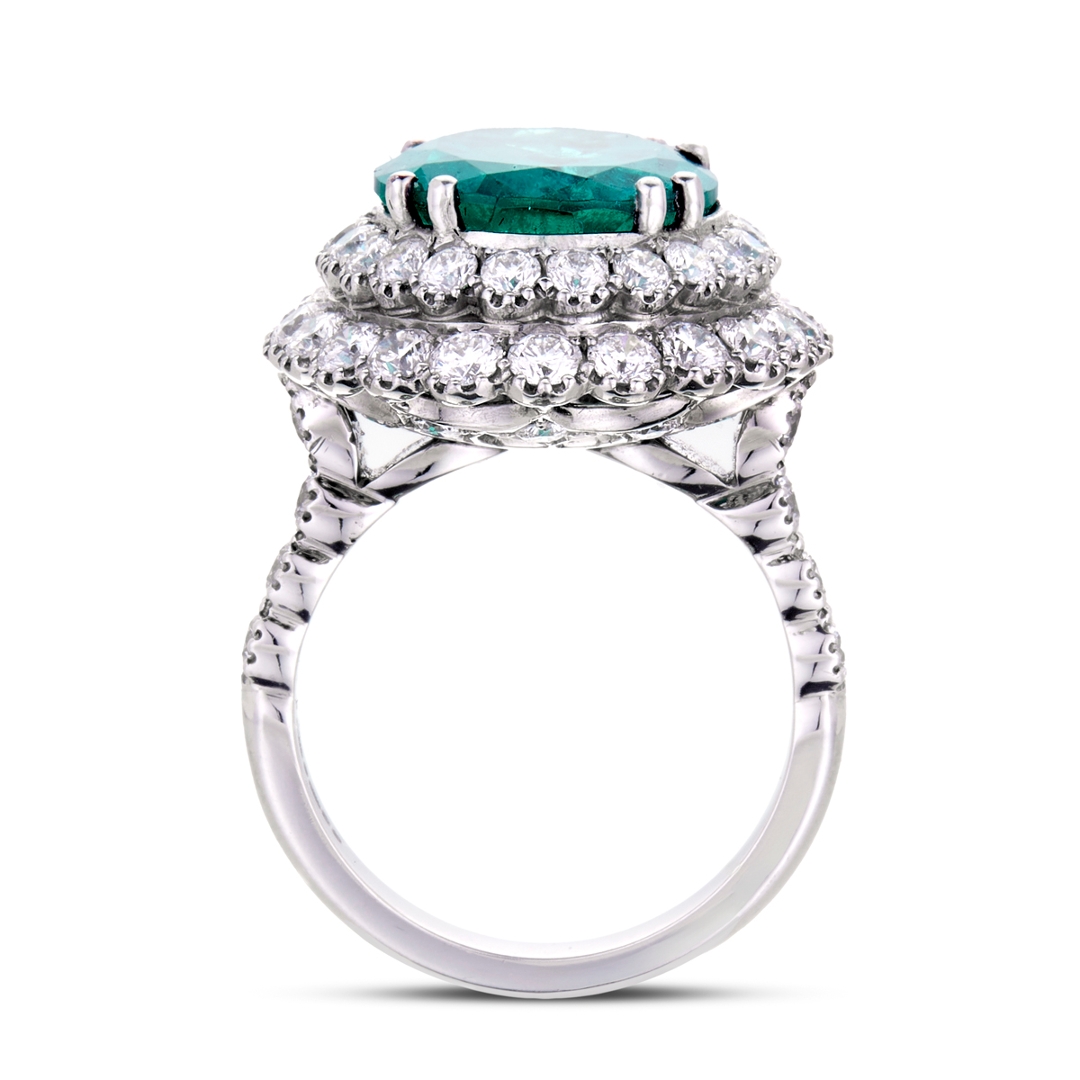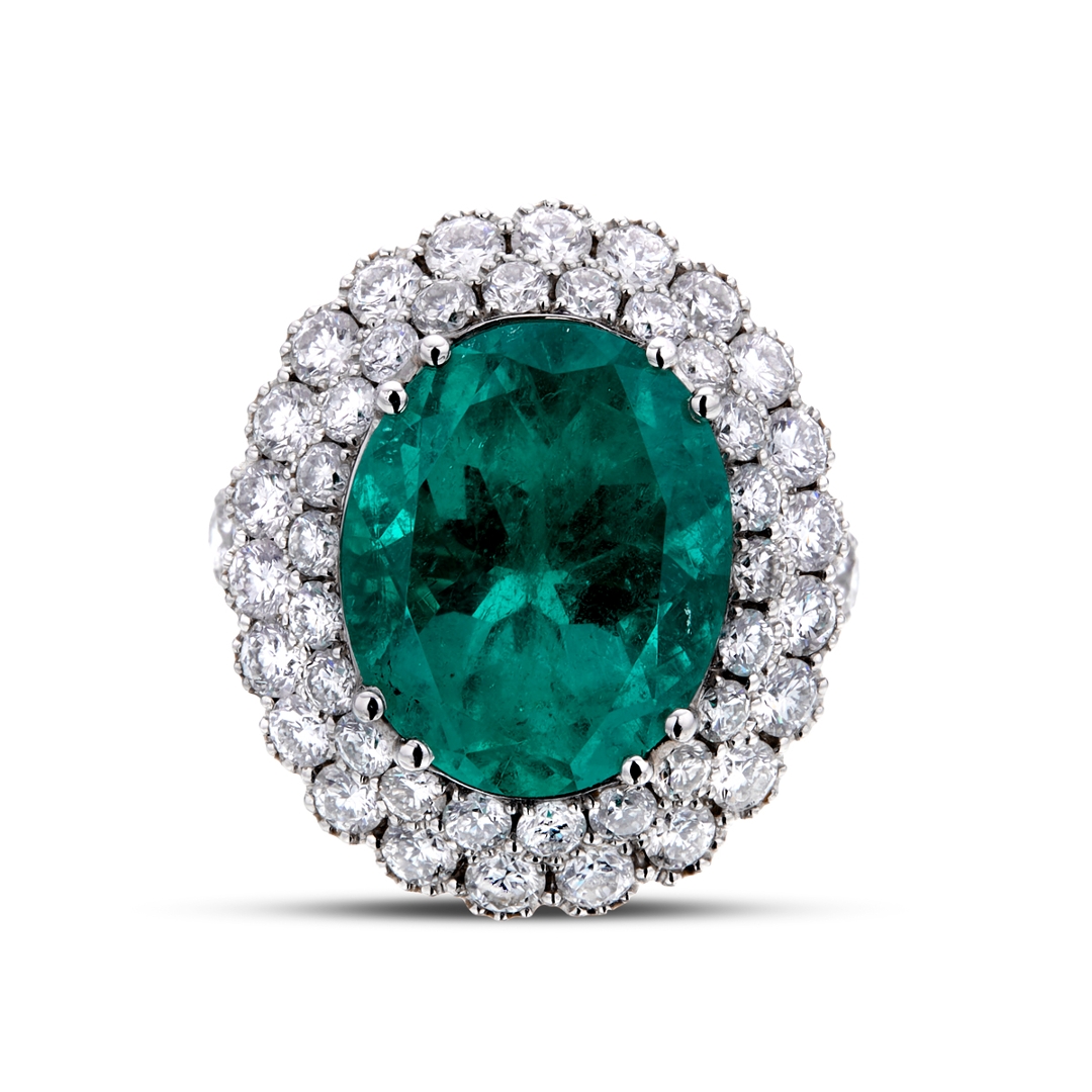A brand-new, unused, certified natural diamond & emerald gemstone oval-shaped cluster ring, set with one oval-cut emerald gemstone at the centre & a cluster of brilliant-cut diamonds in a double halo setting & to the shoulders, set in platinum.