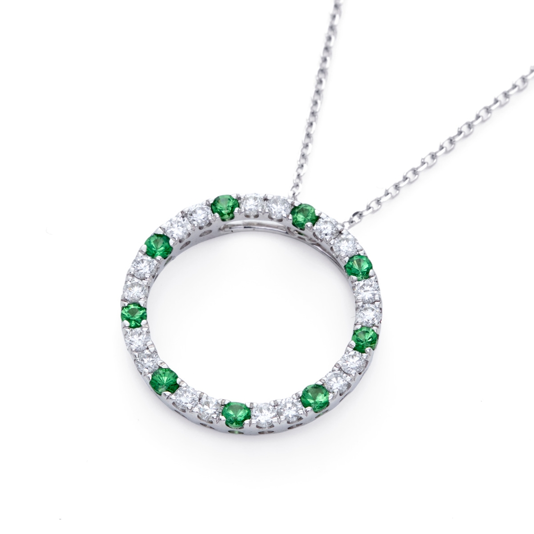 A brand-new, unused, certified natural diamond & green garnet circle-shaped cluster pendant, with nine round-cut green garnet gemstones & eighteen brilliant-cut diamonds, in 18ct white gold.