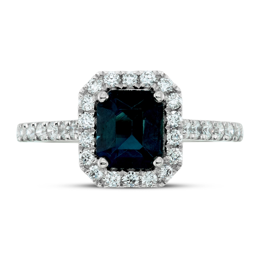 A brand-new, unused certified natural diamond and green sapphire cluster ring that exudes sophistication, rarity, and refined luxury. At its centre lies a 1.63-carat octagonal step-cut green sapphire, displaying an alluring bluish-green hue that shifts beautifully in the light. Surrounding the central gemstone is a halo of brilliant-cut natural diamonds, which continue elegantly along the shoulders to create a radiant, balanced composition. The diamonds, totalling 0.64 carats, are graded G–H in colour and SI1–SI2 in clarity, offering a bright, lively sparkle that perfectly enhances the sapphire’s vivid tone.