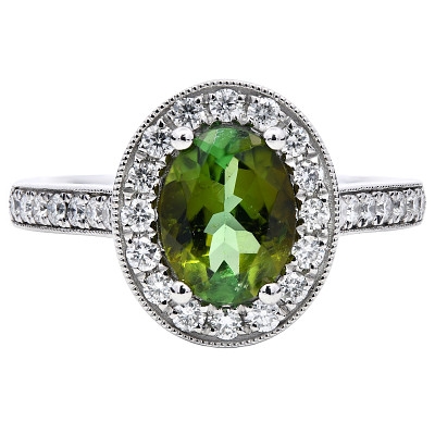 Natural Green Tourmaline 1.20ct & Diamond 0.38ct Oval Shaped Cluster Ring