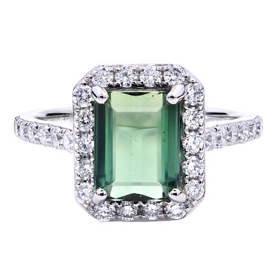 - > Natural Green Tourmaline 1.50ct & Diamond 0.58ct Emerald Shaped Cluster Ring