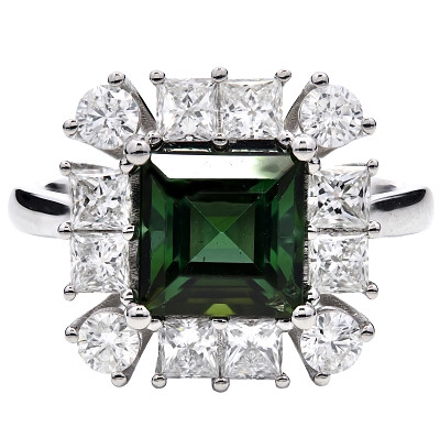 - > Natural Green Tourmaline 2.00ct & Diamond 1.14ct Princess Shaped Cluster Ring