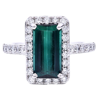 A brand-new, unused, certified platinum natural diamond & green tourmaline gemstone baguette-shaped cluster ring, set with one emerald-cut green tourmaline gemstone at the centre & a cluster of brilliant-cut diamonds in a halo setting & to the shoulders.