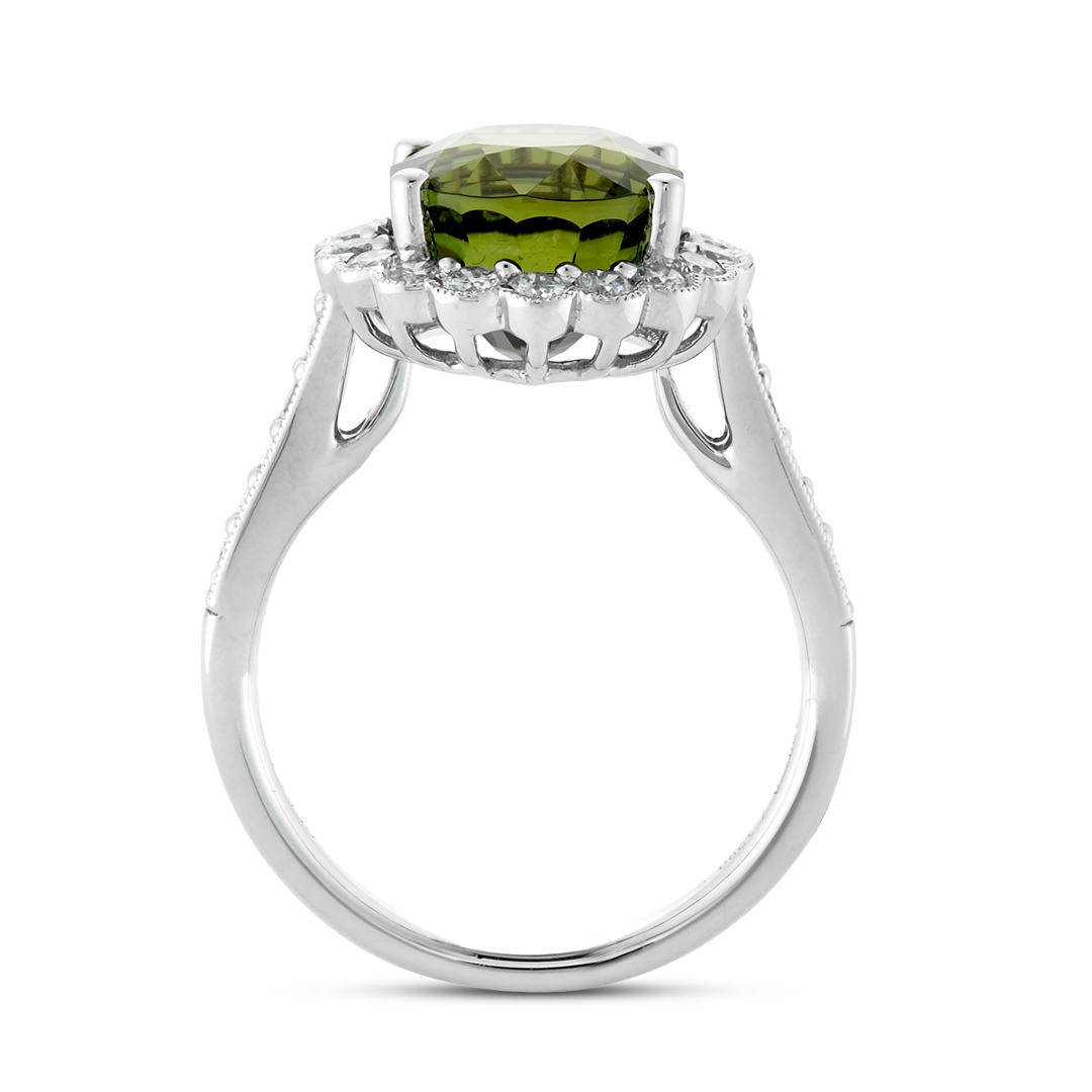 A brand-new, unused certified natural diamond and green tourmaline cluster ring that showcases exquisite craftsmanship and vibrant natural beauty. At its centre lies a magnificent 5.08-carat oval mixed-cut green tourmaline, radiating a rich yellowish-green hue with captivating brilliance and depth. Surrounding the central gemstone is a floral-inspired halo of brilliant-cut natural diamonds that continue along the shoulders, creating a dazzling display of light and symmetry. The diamonds, totalling 0.76 carats, are graded G–H in colour and SI1–SI2 in clarity, providing a luminous sparkle that perfectly enhances the tourmaline’s vivid tone.