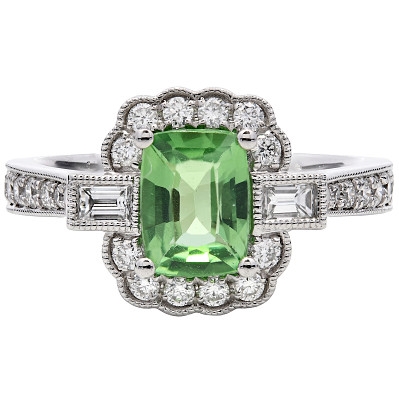 A brand-new, unused, certified natural diamond & green tsavorite gemstone cluster ring, set with one cushion-cut tsavorite gemstone at the centre & a cluster of brilliant-cut and two baguette-cut diamonds in a halo setting, with a cluster of brilliant-cut diamonds on the shoulders, set in platinum.