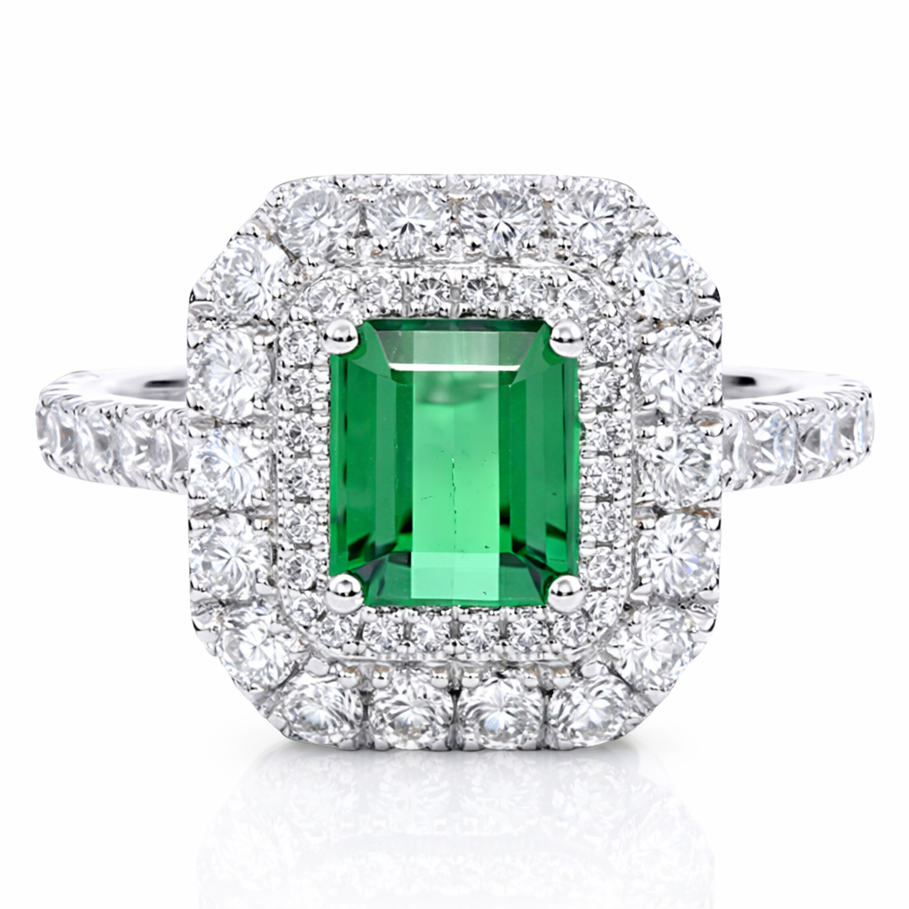 A brand-new, unused certified natural diamond and mint tourmaline cluster ring, crafted in platinum and designed to showcase both colour and brilliance in an elegant and contemporary composition. At its centre sits a beautifully proportioned emerald-cut mint tourmaline weighing 1.33 carats, displaying a refined pastel green tone that feels both fresh and sophisticated. The clean lines of the emerald cut allow the stone’s natural clarity and gentle colour to present themselves effortlessly, creating a striking focal point that feels distinctive yet timeless.