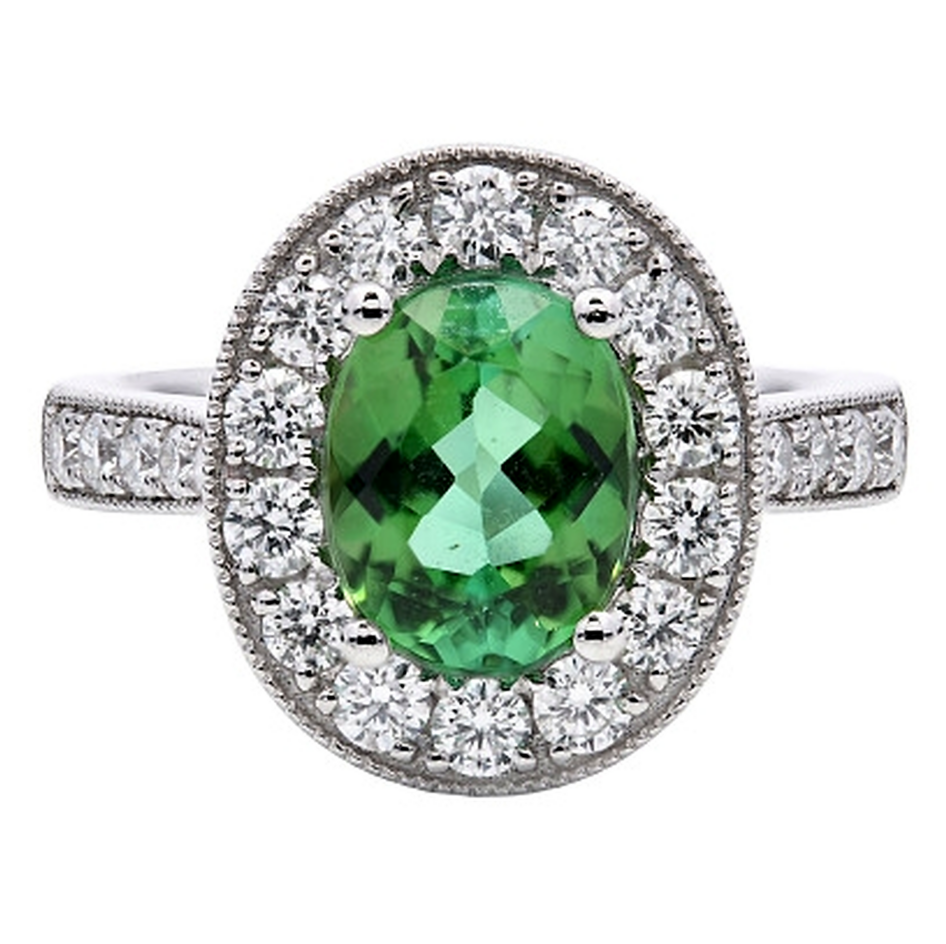 - > Natural Mint Tourmaline 1.66ct & Diamond 0.66ct Oval Shaped Cluster Ring