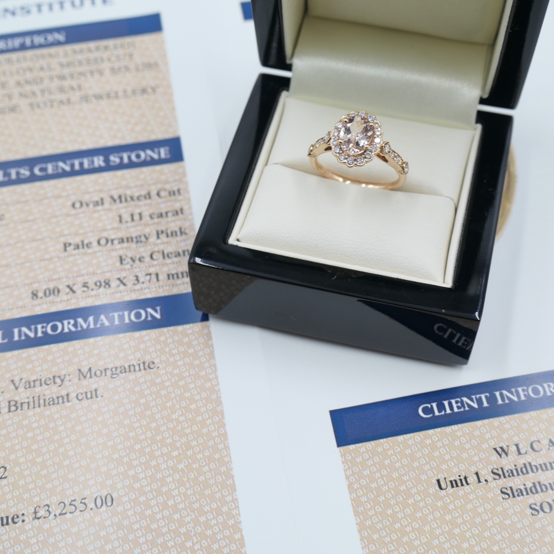 With a professional valuation of £3,255, this certified 18ct rose gold morganite and diamond cluster ring is a piece of timeless beauty and long-term value. With natural diamonds renowned for their lasting investment appeal and morganite’s romantic charm, it represents sophistication, quality, and enduring elegance.
