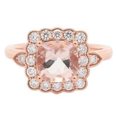 A brand-new, unused certified 18ct rose gold ring featuring a radiant 1.20ct cushion-cut morganite gemstone at its centre, admired for its delicate blush-pink hue and exceptional clarity. The centre stone is framed in an elegant flower-shaped cluster, accented by two natural brilliant-cut diamonds on the sides and additional smaller diamonds, totalling 0.38ct. The warm tone of the rose gold beautifully enhances the soft colour of the morganite, while the diamonds add brilliance and contrast, creating a ring that perfectly balances romance and refinement.