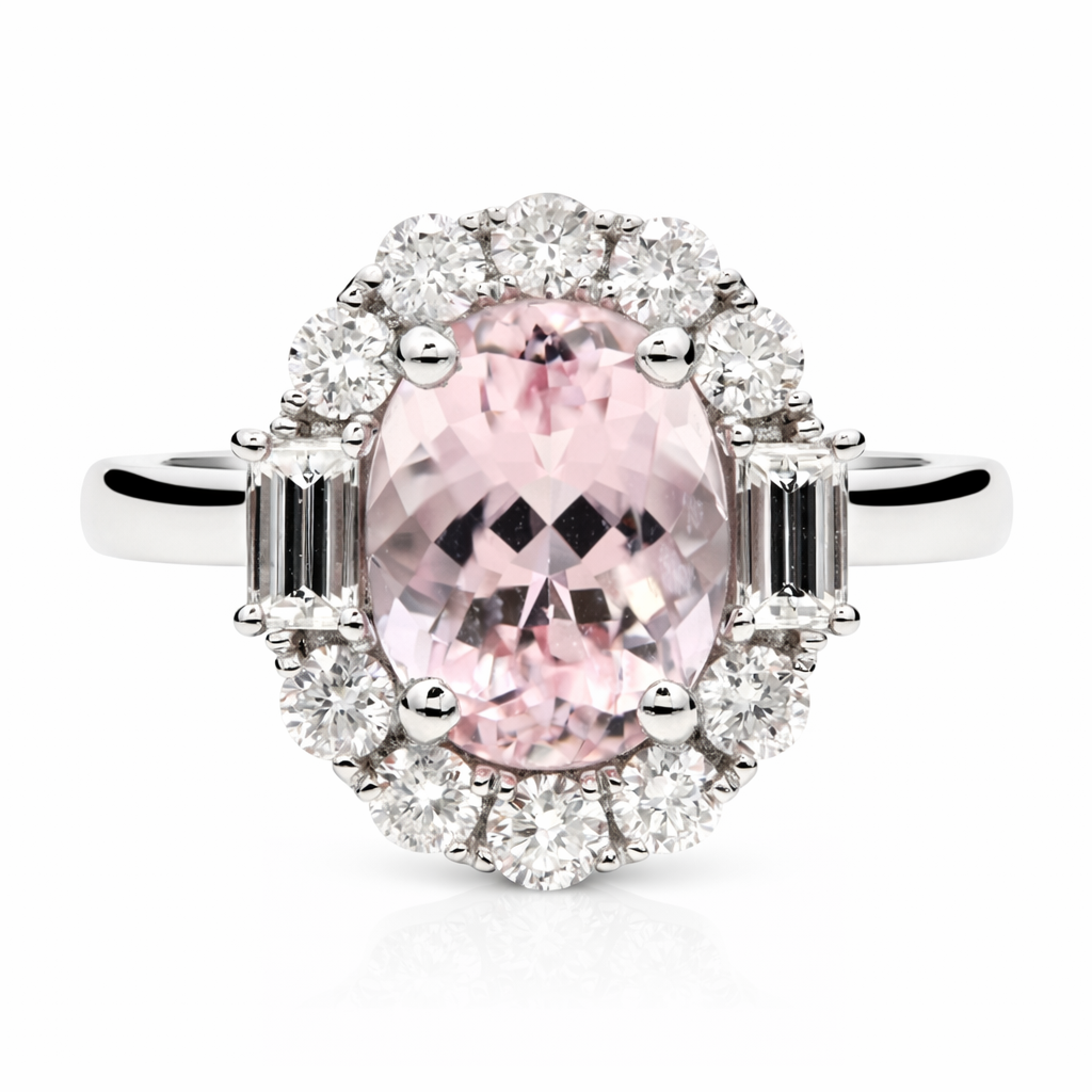 Framing the centre stone are two baguette-cut natural diamonds positioned on either side, accompanied by a halo of ten brilliant-cut diamonds that complete the cluster design. These diamonds have a combined weight of 0.70ct and introduce impressive sparkle, creating a bright contrast against the gentle hue of the morganite. Natural diamonds are consistently celebrated for their rarity, remarkable strength and enduring desirability, qualities that have secured their position as the most recognised gemstone in fine jewellery.