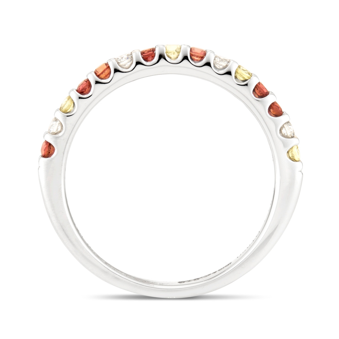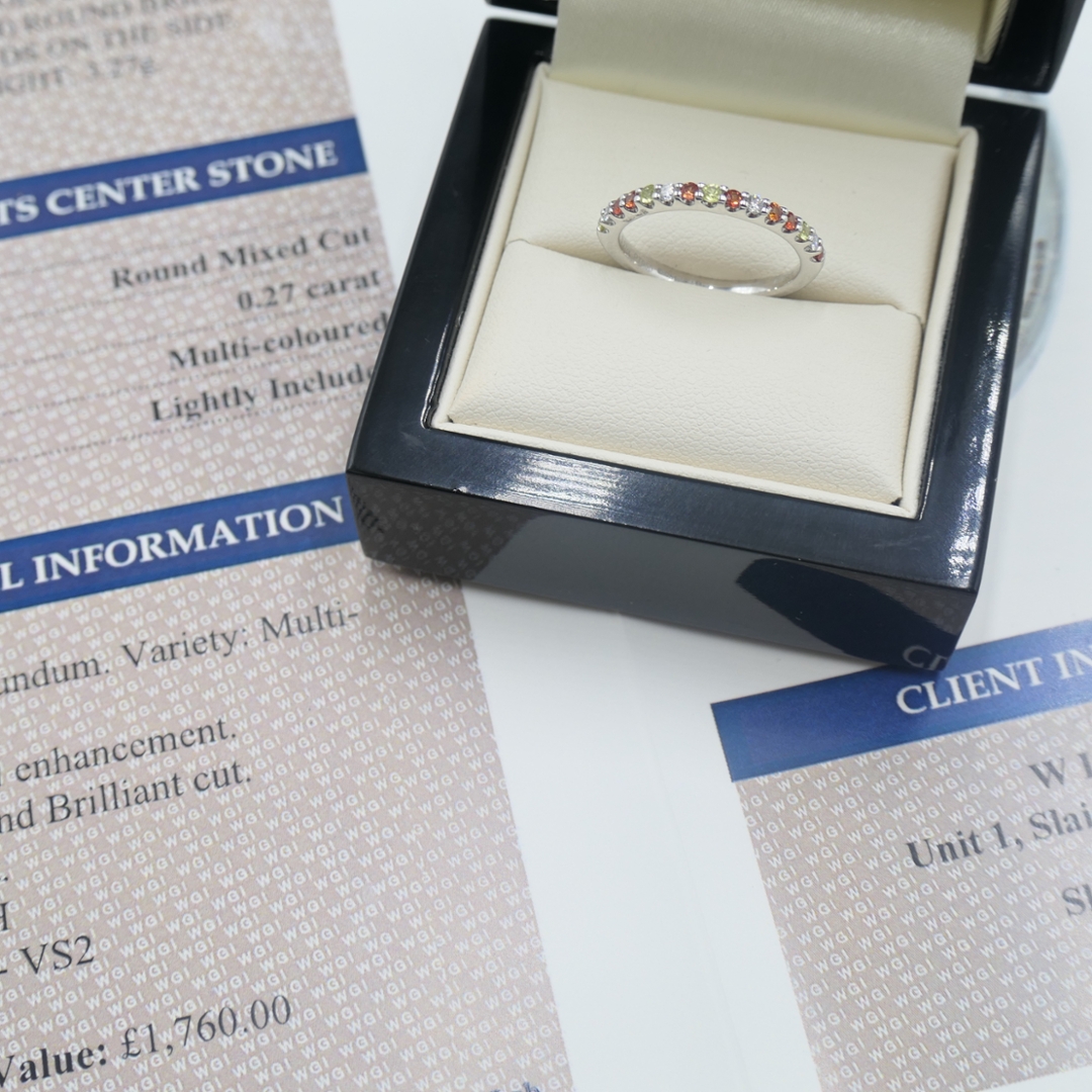 A brand-new, unused certified platinum cluster ring, elegantly designed to combine the vibrant beauty of sapphires with the timeless sparkle of natural diamonds. Set with a total of 0.27ct of round, mixed-cut, multi-coloured sapphires, each gemstone has been carefully selected for its vivid hue, clarity, and brilliance, creating a delicate yet striking display of colour around the band. Enhancing the sapphires are 0.09ct of mixed cut natural diamonds, graded G-H in colour and VS1-VS2 in clarity. Their bright, crisp sparkle contrasts beautifully with the richness of the sapphires and the cool, enduring lustre of the platinum setting, giving the ring a refined and luxurious finish.