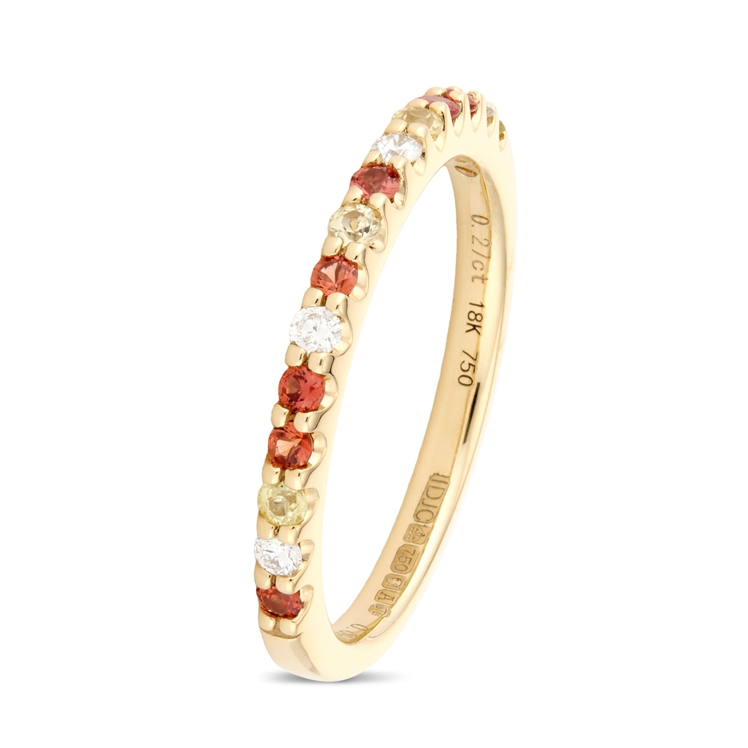 A brand-new, unused certified 18ct yellow gold eternity ring, crafted to blend the vivid beauty of sapphires with the timeless sparkle of natural diamonds. Set with a total of 0.27ct of round, mixed-cut, multi-coloured sapphires, each gemstone has been carefully selected for its vibrant hue, clarity, and brilliance, forming a lively and elegant band of colour. Enhancing this display are 0.09ct of mixed cut natural diamonds, graded G-H in colour and VS2-SI1 in clarity. The bright, crisp sparkle of the diamonds contrasts beautifully with the warm glow of the yellow gold setting, creating a sophisticated design that is both eye-catching and refined.