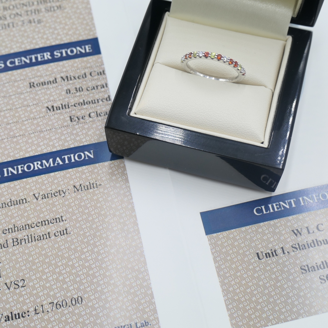 A brand-new, unused certified platinum cluster ring, 3.41 grams, crafted to showcase the vibrant elegance of sapphires alongside the timeless beauty of natural diamonds. Set with a total of 0.30ct of round, mixed-cut, multi-coloured sapphires, each gemstone has been carefully selected for its vivid hue, clarity, and sparkle, creating a lively yet refined display of colour that flows seamlessly around the band. Accompanying the sapphires are 0.08 ct of mixed-cut natural diamonds, graded G-H in colour and VS1-VS2 in clarity. Their crisp, bright brilliance contrasts perfectly with the richness of the sapphires and the enduring superb lustre of platinum, adding both sophistication and charm to the piece.