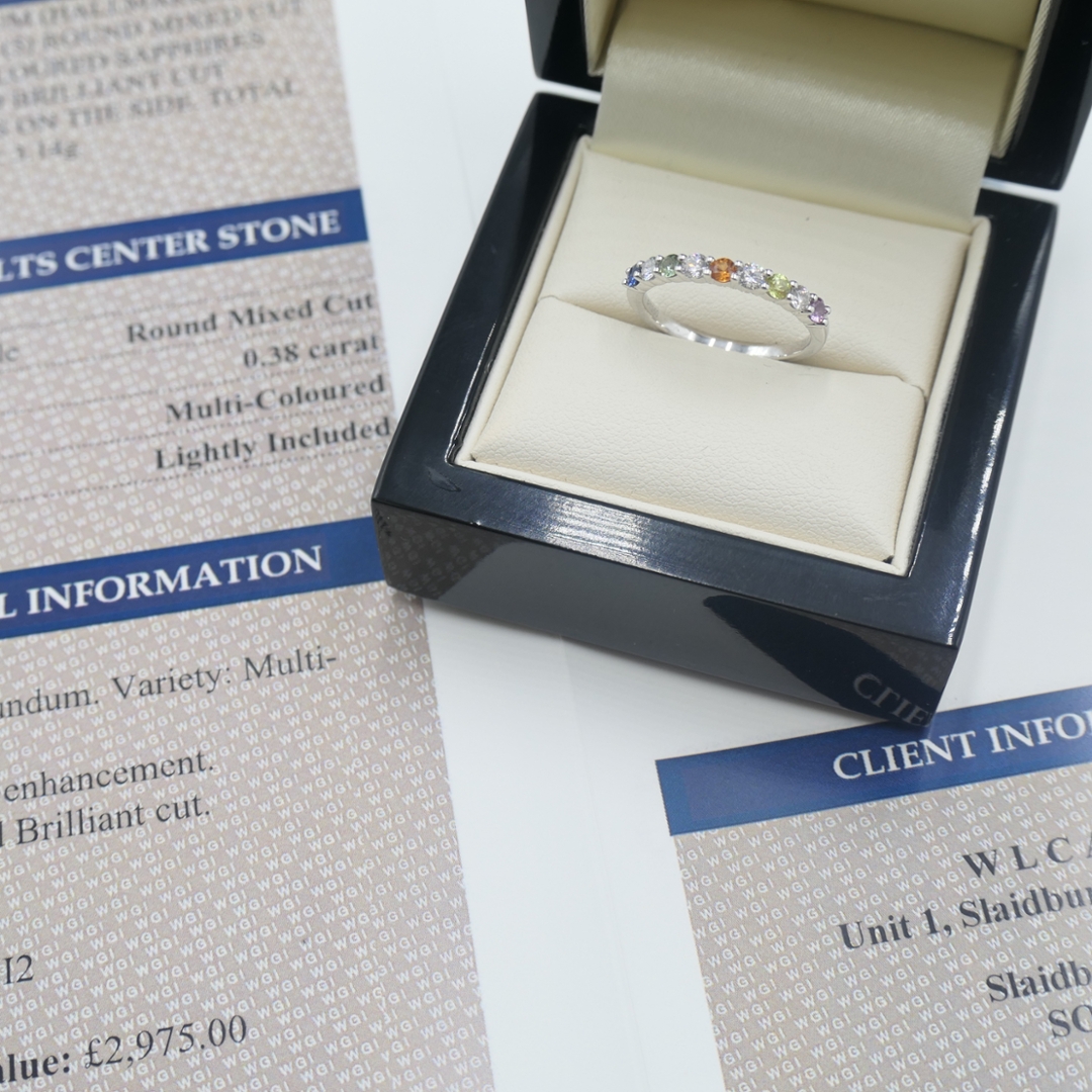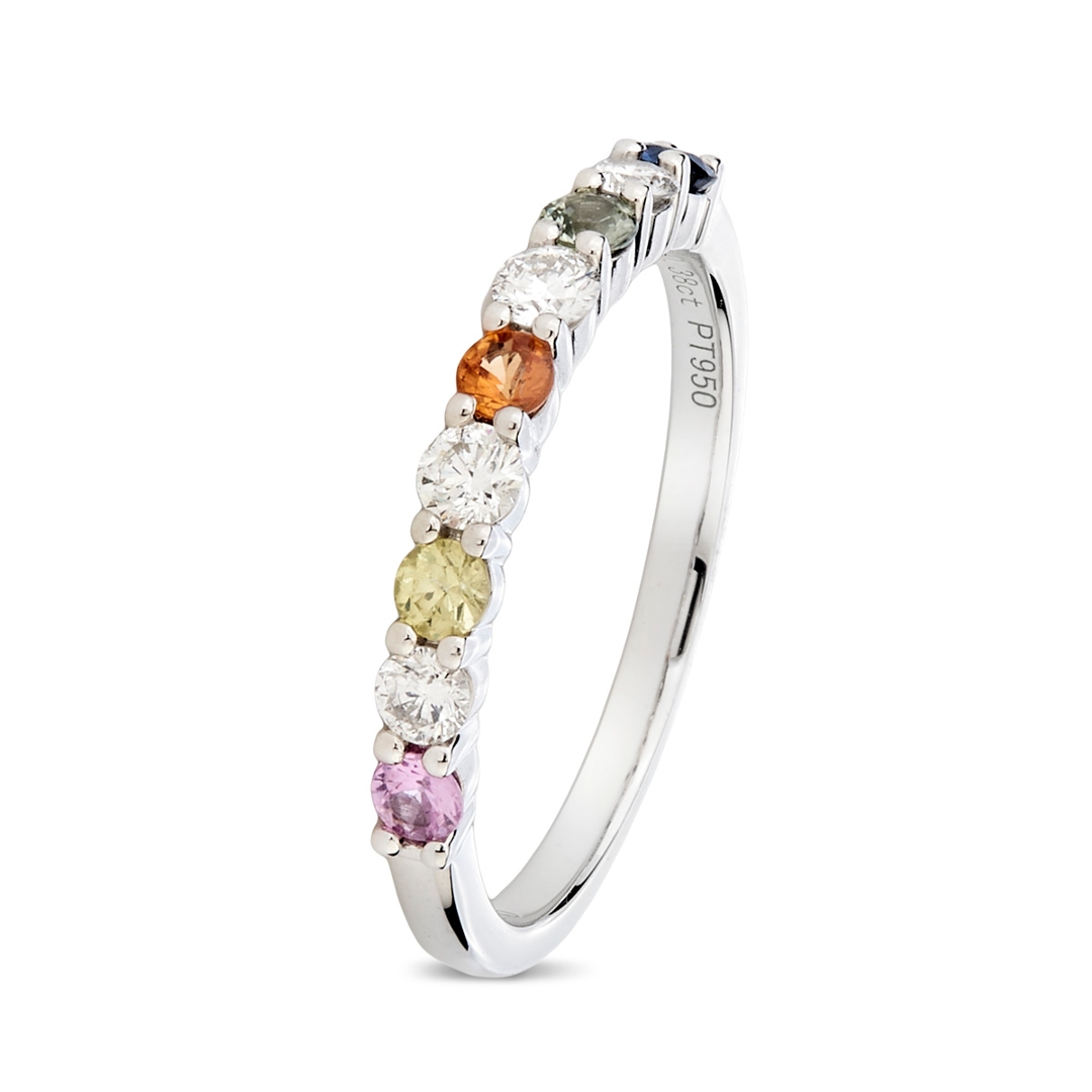A brand-new, unused certified platinum ring, beautifully crafted to combine the lively colours of sapphires with the enduring sparkle of diamonds. The design features a cluster of round, mixed-cut, multi-coloured sapphires, totalling 0.38ct, each gemstone displaying its own vivid hue and natural character. These are complemented by mixed-cut natural diamonds with a combined weight of 0.25ct, graded F-G in colour and SI1-SI2 in clarity, offering a crisp brilliance that contrasts elegantly against the cool sheen of the platinum setting. The arrangement flows seamlessly around the band, creating a continuous display of colour and light that is both eye-catching and refined.