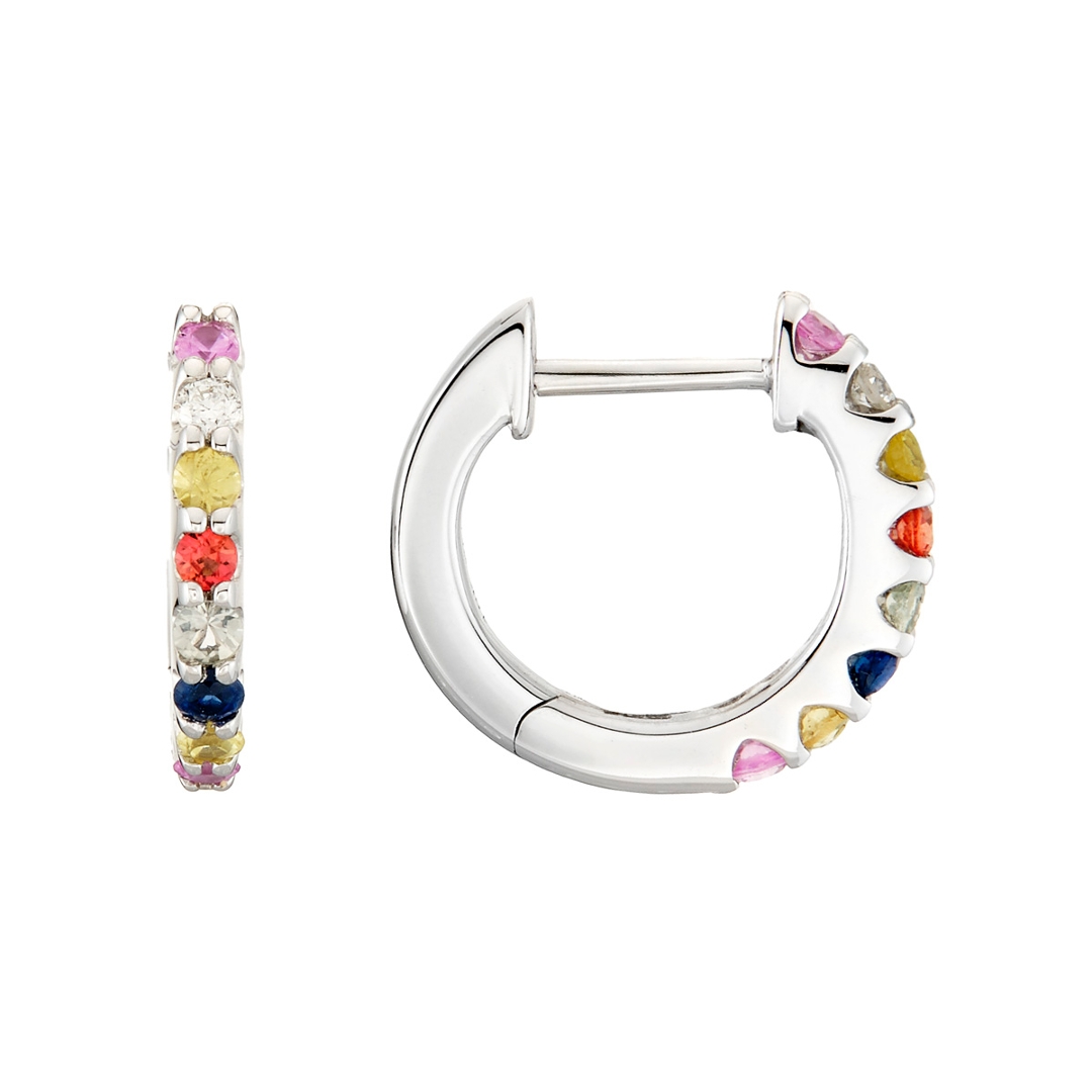 A brand-new, unused, certified pair of natural diamond & multi-coloured sapphire gemstone hooped earrings, set with a cluster of round mixed-cut multi-coloured sapphire gemstones & two brilliant-cut diamonds, set in 18ct white gold.