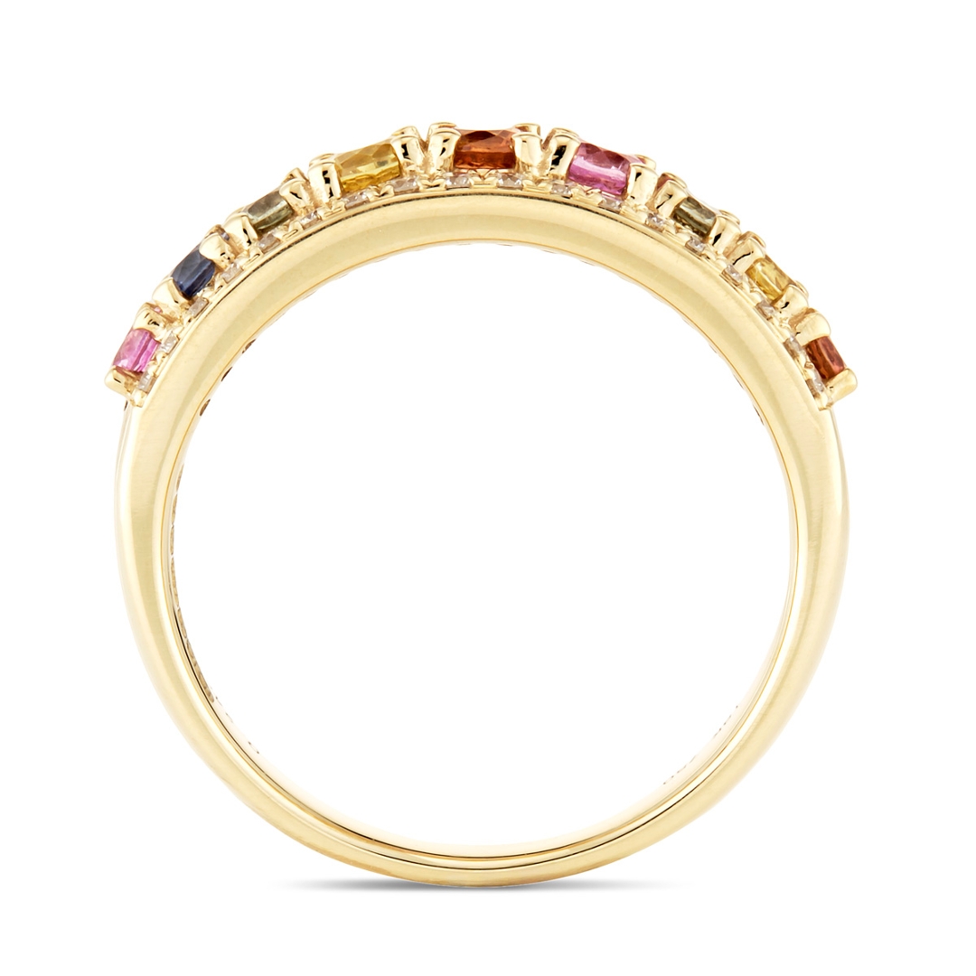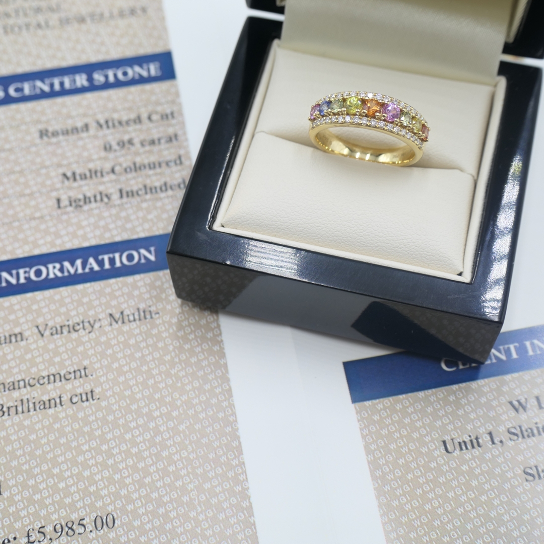 A brand-new, unused certified 18ct yellow gold cluster ring, beautifully designed to combine the rich vibrancy of sapphires with the timeless elegance of natural diamonds. Set with a total of 0.95ct of round, mixed-cut, multi-coloured sapphires, each gemstone has been carefully chosen for its vivid hue, clarity, and brilliance, creating a continuous flow of colour encircling the band. Accentuating the sapphires are 0.24ct of mixed cut natural diamonds, graded F-G in colour and VS2-SI1 in clarity, whose bright, crisp sparkle contrasts perfectly with the warmth of the yellow gold setting. This harmonious blend of colour and light ensures the ring is both striking and versatile.
