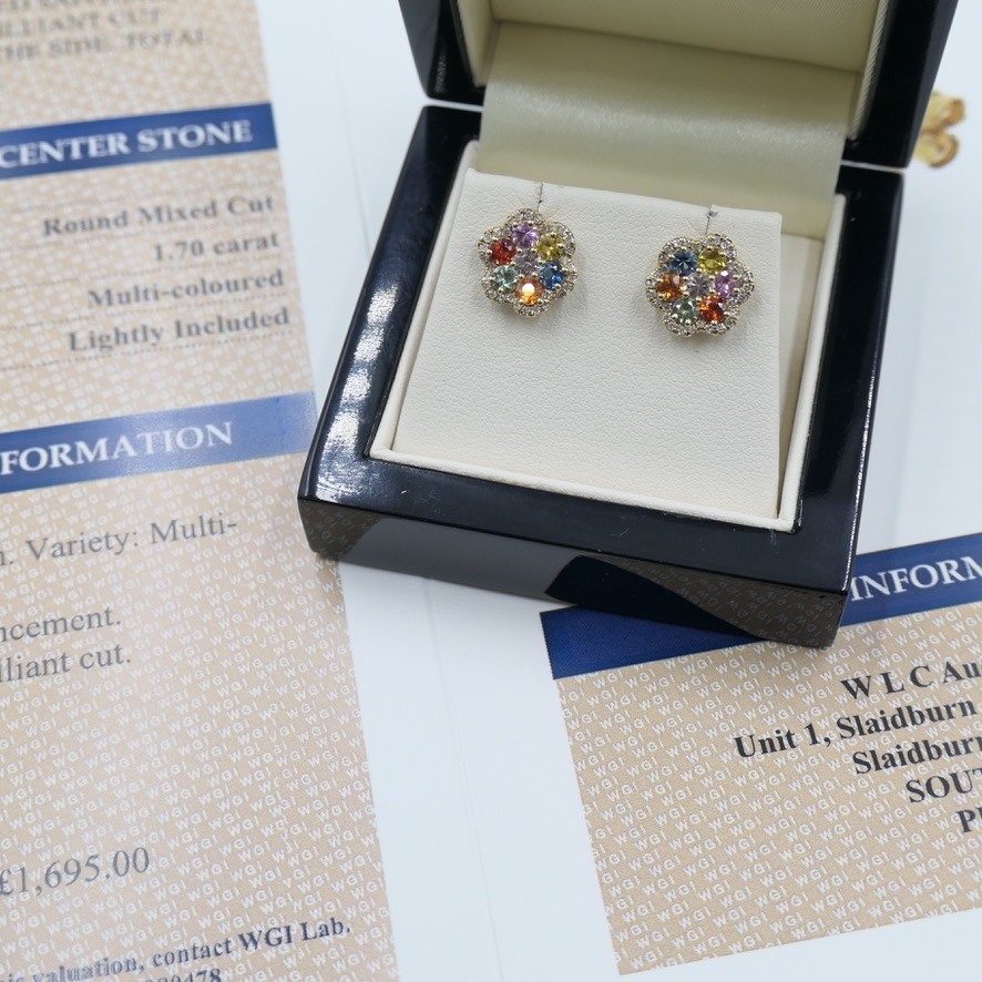 - > Natural Multi-Coloured Sapphire 1.70ct & Diamond 0.22ct Flower Shaped Cluster Earrings