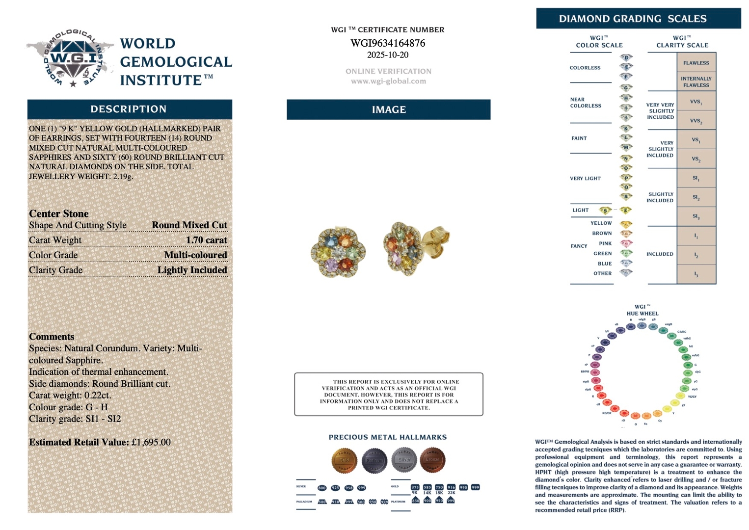 A brand-new, unused certified pair of natural diamond and multi-coloured sapphire gemstone cluster earrings, delightfully crafted in 9ct yellow gold. Each earring features a vibrant flower-shaped arrangement of round mixed-cut sapphires, totalling 1.70 carats, displaying a stunning array of multicoloured hues that radiate joy and sophistication. Accentuating the lively sapphires is a delicate cluster of brilliant-cut natural diamonds, totalling 0.22 carats, with G-H colour and SI1–SI2 clarity. The warm glow of the yellow gold setting enhances both the sparkle of the diamonds and the kaleidoscopic beauty of the sapphires, resulting in a striking design full of colour and elegance.