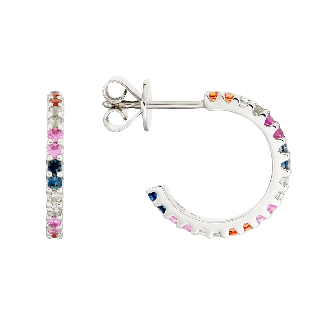 A brand-new, unused certified pair of 18ct white gold hooped earrings, designed to showcase the vibrant beauty of natural sapphires in a timeless and elegant style. Set with a total of 0.68ct of round, mixed-cut, multi-coloured sapphires, each gemstone has been carefully chosen for its vivid hue, clarity, and lively brilliance. The harmonious blend of colours, from rich blues and deep pinks to warm yellows and fresh greens, creates a captivating display that is perfectly complemented by the cool sheen of the white gold setting. The classic hoop design ensures they are versatile enough for both everyday wear and special occasions, while still making a refined statement. With a weight of 3.19 grams.