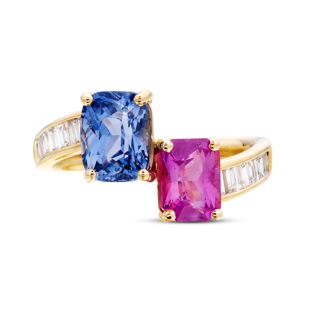 A brand-new, unused, certified natural diamond & multi sapphire emerald-cut toi et moi ring, set with one octagonal mixed-cut pink sapphire & one cushion mixed-cut blue sapphire gemstones at the centre & a cluster of baguette-cut diamonds to the shoulders, set in 18ct yellow gold.