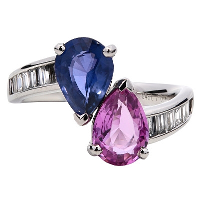 A brand-new, unused, certified natural diamond & multi-sapphire toi et moi ring, with one pear-cut blue sapphire & one pear-cut pink sapphire gemstones at the centre & a cluster of baguette-cut diamonds to the shoulders, set in platinum.