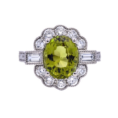 A brand-new, unused, certified natural diamond & olive tourmaline flower-shaped cluster ring, with one oval-cut olive tourmaline gemstone at the centre, two baguette-cut diamonds to the sides & a cluster of brilliant-cut diamonds in a halo setting & to the shoulders, set in platinum.