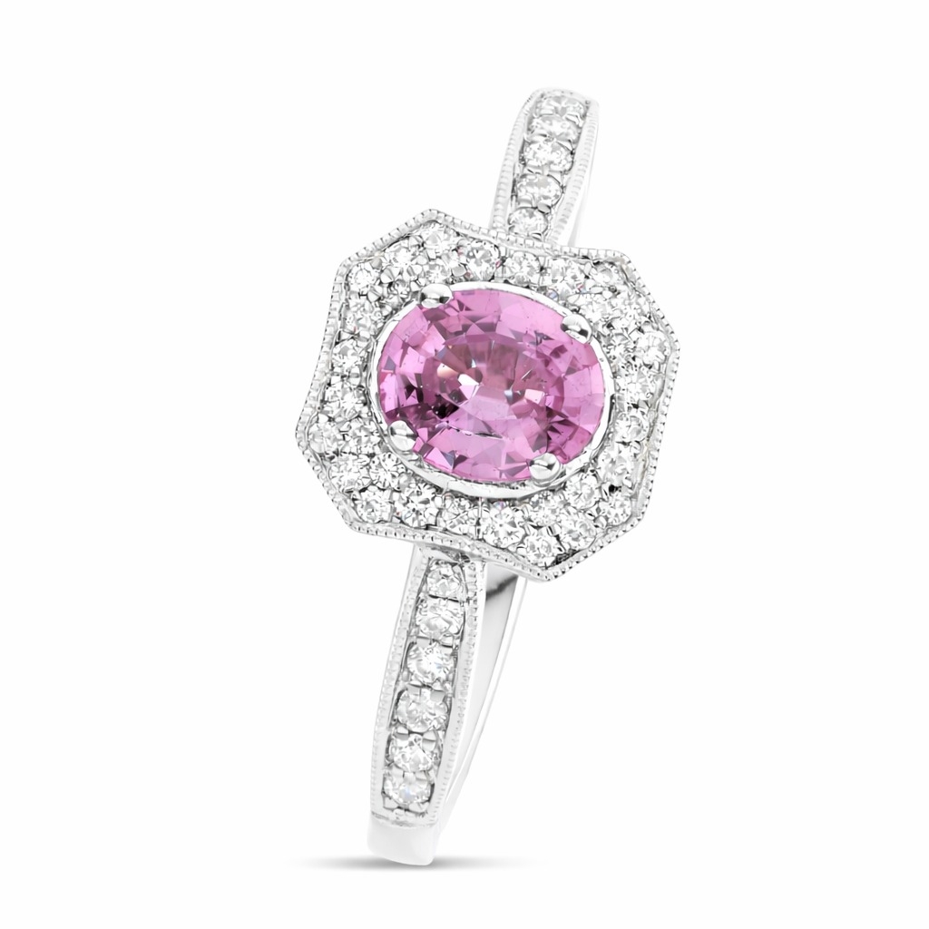 A brand-new, unused, certified natural diamond and pink sapphire gemstone cluster ring, this graceful piece blends romantic colour with refined craftsmanship. At its centre lies a 0.48-carat oval mixed-cut pink sapphire, displaying a captivating purplish-pink hue that radiates femininity and charm. Surrounding the sapphire is a delicate halo of brilliant-cut natural diamonds, with additional diamonds continuing along the shoulders. Together, the diamonds total 0.16 carats, graded G–H in colour and SI1–SI2 in clarity, adding a soft, shimmering contrast that enhances the sapphire’s natural vibrancy and depth.