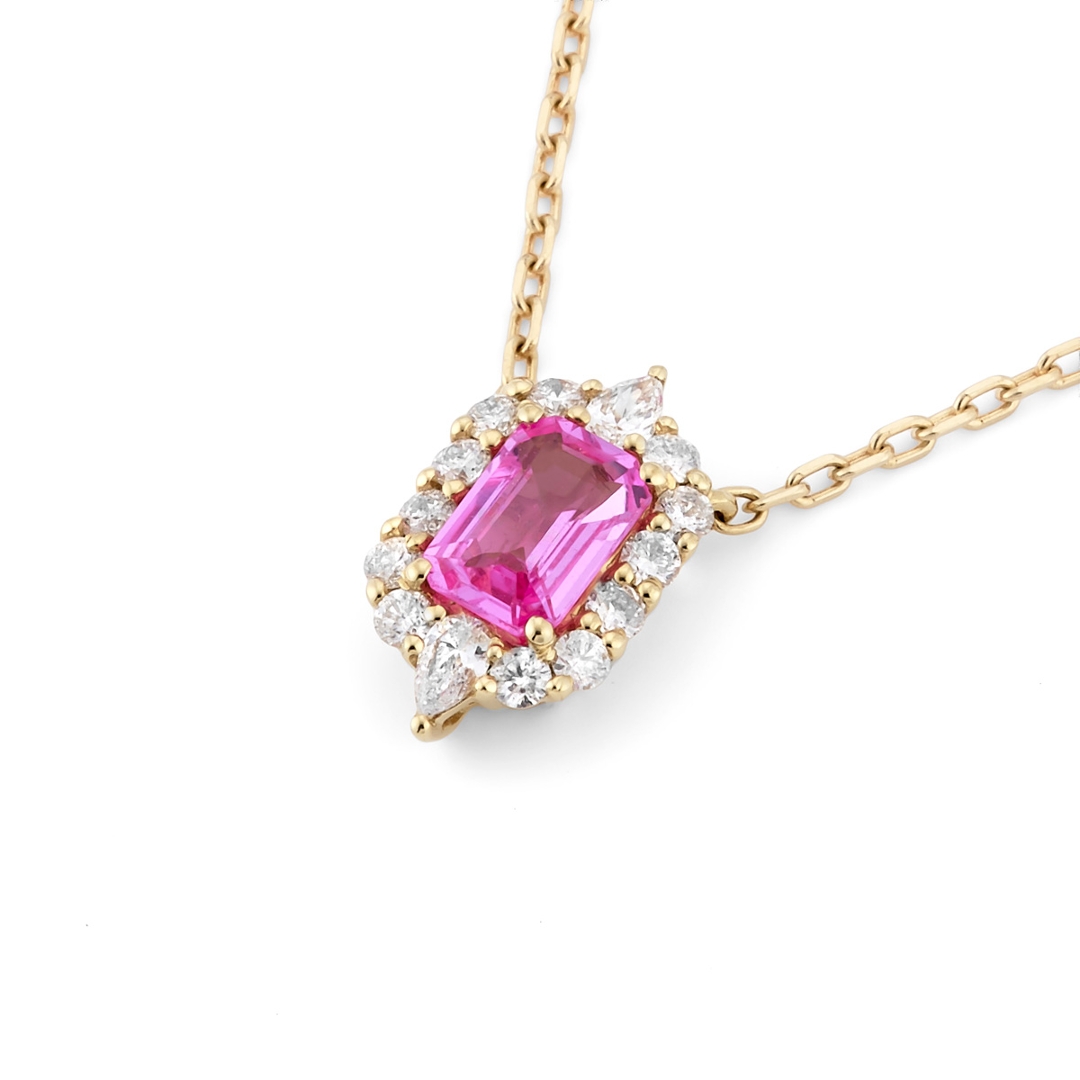 A brand-new, unused, certified natural diamond & pink sapphire gemstone cluster pendant, set with one octagonal step-cut pink sapphire gemstone at the centre & a cluster of brilliant-cut diamonds in a halo setting, set in 18ct yellow gold.