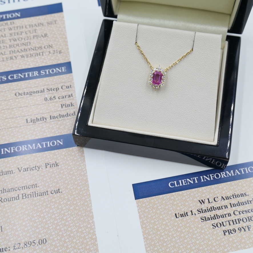 A brand-new, unused, certified natural diamond & pink sapphire gemstone cluster pendant, set with one octagonal step-cut pink sapphire gemstone at the centre & a cluster of brilliant-cut diamonds in a halo setting, set in 18ct yellow gold.