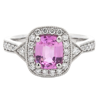 A brand-new, unused, certified platinum natural diamond & pink sapphire gemstone cushion-shaped cluster ring, set with one cushion-cut pink sapphire gemstone at the centre & a cluster of brilliant-cut diamonds in a halo setting & to the shoulders.
