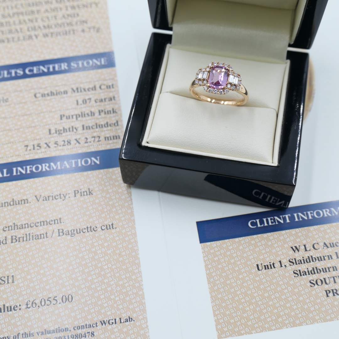 A brand-new, unused certified natural diamond and pink sapphire cluster ring that beautifully combines luxury, artistry, and timeless elegance. At its heart lies a 1.07-carat cushion mixed-cut pink sapphire, radiating a captivating purplish-pink hue that shimmers with warmth and sophistication. Framing the centre gemstone are four baguette-cut natural diamonds set on each side, complemented by a halo of brilliant-cut diamonds that enhance the ring’s luminous presence. With a total diamond weight of 0.45 carats, graded G–H in colour and VS2–SI1 in clarity, the diamonds offer outstanding sparkle and purity, perfectly accentuating the sapphire’s vivid tone.