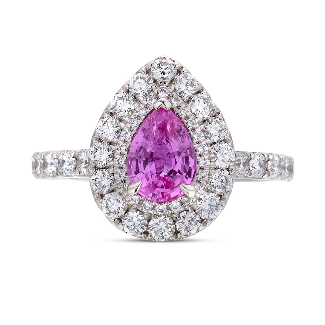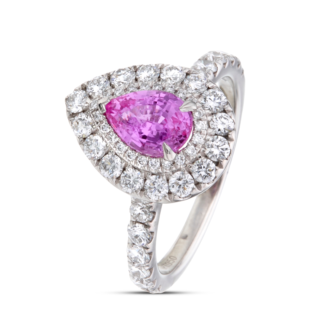 A brand-new, unused, certified natural diamond & pink sapphire pear-shaped cluster ring, set with one pear mixed-cut pink sapphire gemstone at the centre & a cluster of brilliant-cut diamonds in a double halo setting & to the shoulders, set in platinum.