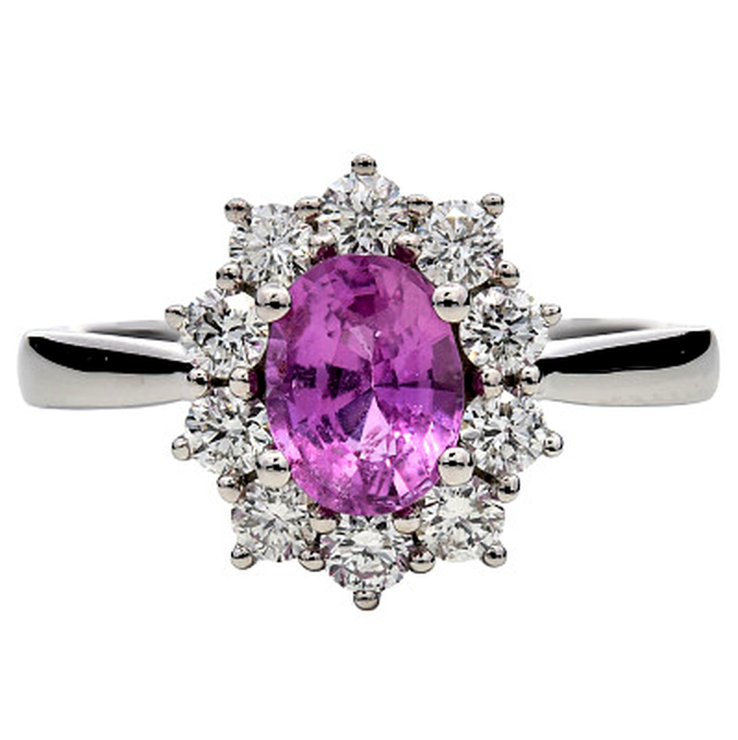 A brand-new, unused certified natural diamond and pink sapphire cluster ring, beautifully crafted in platinum and designed to highlight the delicate contrast between soft colour and radiant brilliance. At the centre of the design sits an elegant oval-cut pink sapphire weighing 1.12ct, displaying a vibrant blush tone that immediately captures attention. The graceful oval cut enhances the gemstone’s natural colour and light reflection, creating a refined focal point that lends the ring a sophisticated, feminine presence within its classic cluster setting.