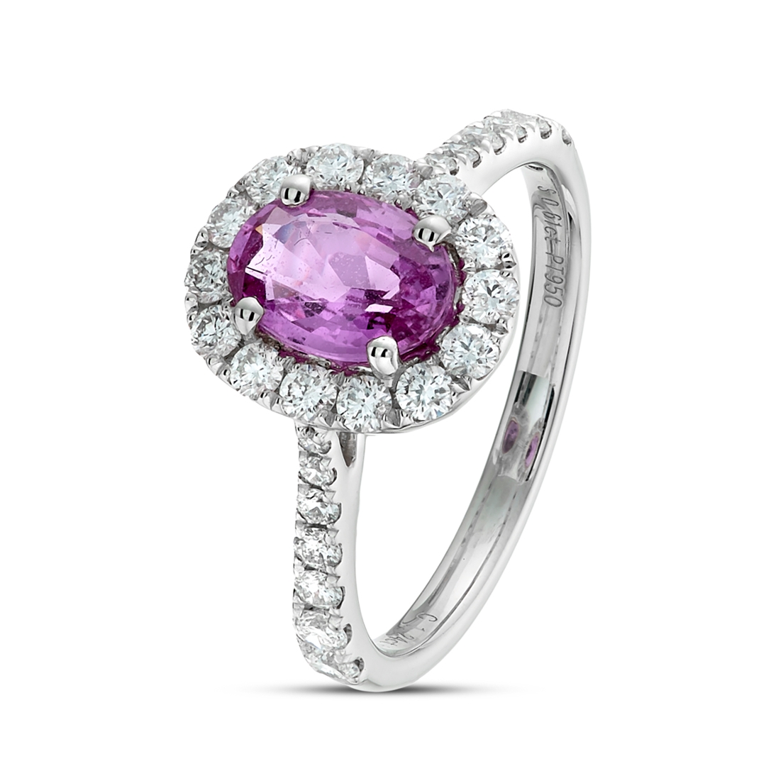 A brand-new, unused certified natural diamond and pink sapphire cluster ring that radiates exceptional beauty, craftsmanship, and value. At its centre lies a 1.24-carat oval mixed-cut pink sapphire of vivid purplish-pink hue, glowing with elegance and striking depth of colour. Surrounding the gemstone is a halo of brilliant-cut natural diamonds that extend along the shoulders, creating a spectacular display of light and sparkle. The diamonds, totalling 0.61 carats, are graded G–H in colour and VS2–SI1 in clarity, offering outstanding brilliance and contrast against the sapphire’s vibrant tone.