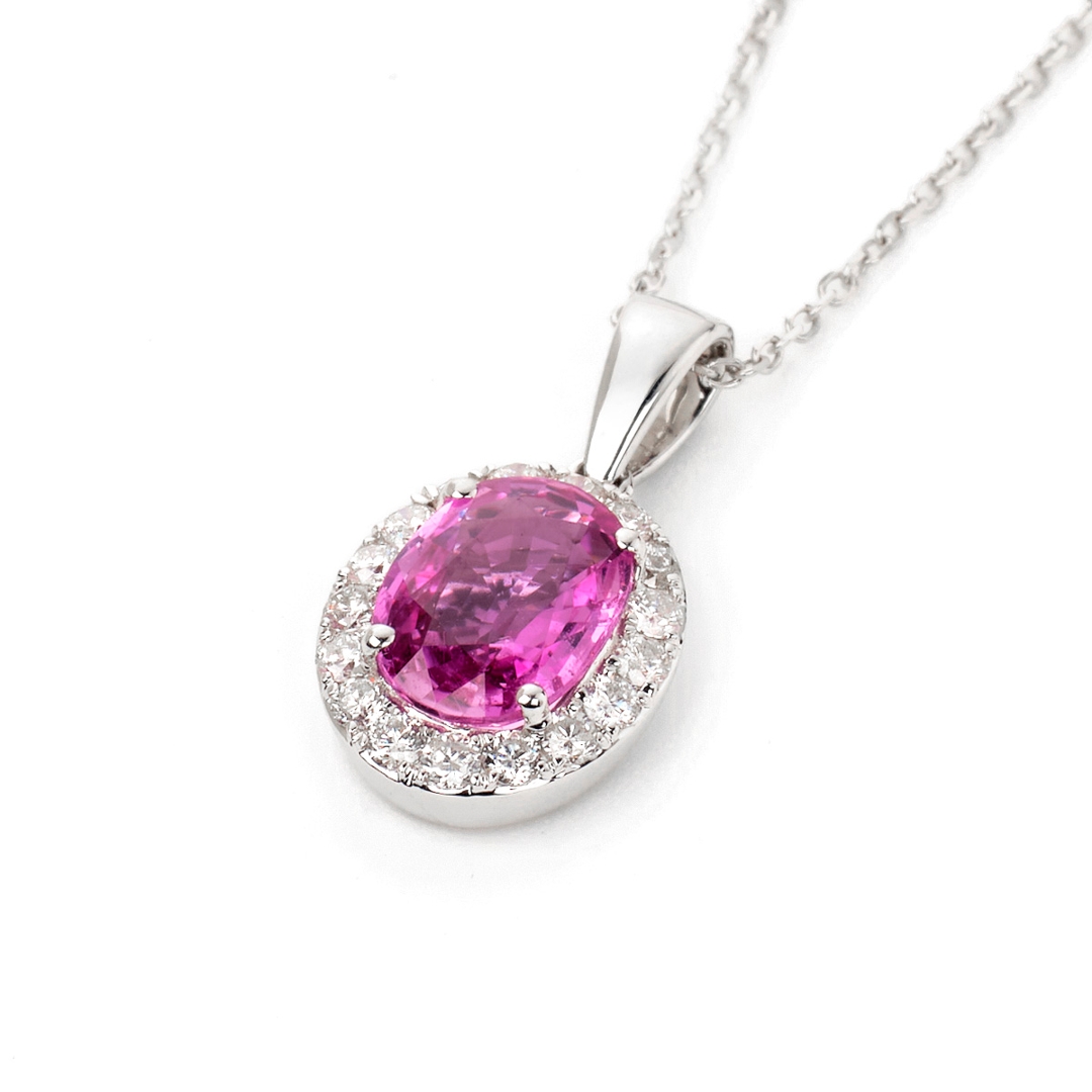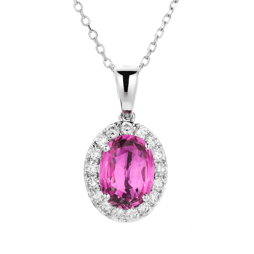 A brand-new, unused, certified natural diamond & pink sapphire gemstone oval-shaped cluster pendant, with one oval mixed-cut pink sapphire gemstone at the centre & a cluster of brilliant-cut diamonds in a halo setting, set in 18ct white gold.