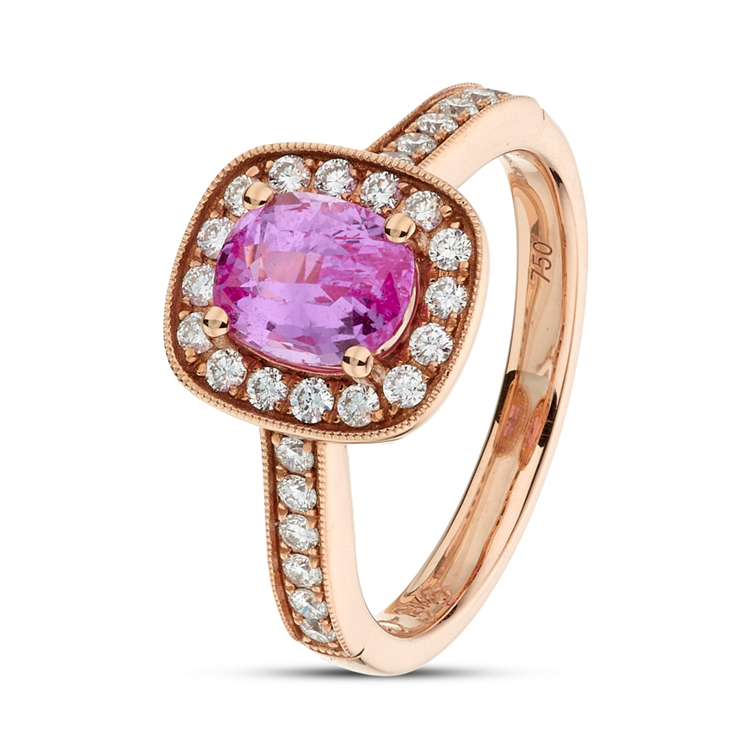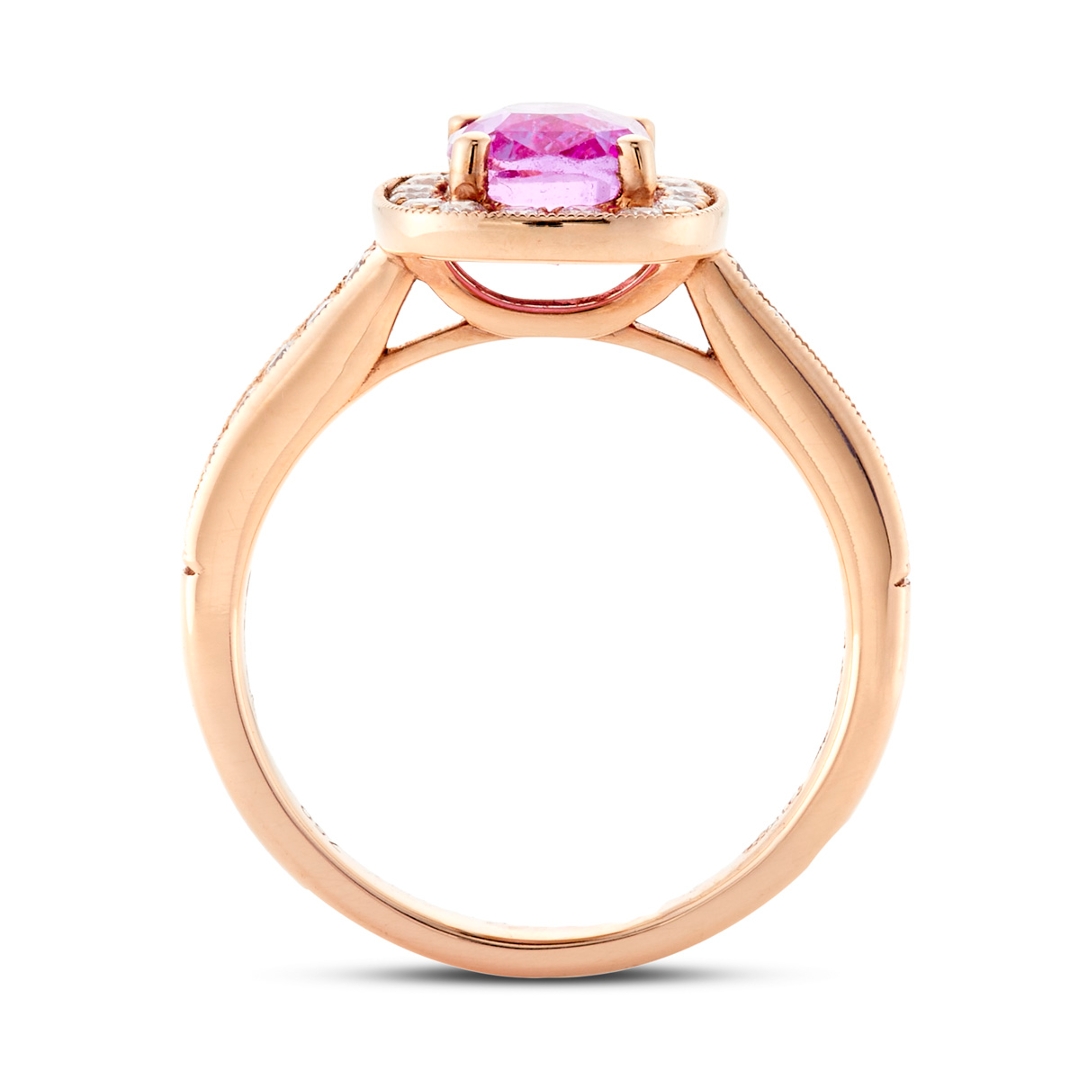 Expertly crafted in 18-carat rose gold and weighing 4.55 grams, this exquisite ring combines timeless romance with contemporary sophistication. The warm blush tones of the rose gold complement the vivid pink sapphire, while amplifying the radiance of the surrounding diamonds. Each gemstone has been meticulously set, reflecting the artistry and precision of fine jewellery craftsmanship.