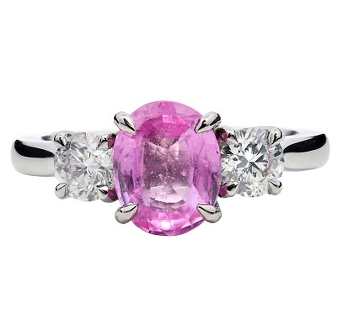 A brand-new, unused, certified natural diamond & pink sapphire three-stone cluster ring, with one oval-cut pink sapphire gemstone at the centre & two brilliant-cut diamonds to the sides, set in platinum.
