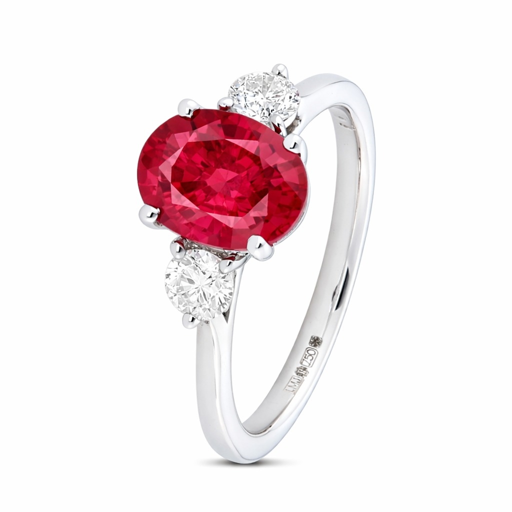 On either side of the sapphire are two brilliant-cut diamonds, with a combined weight of 0.36ct. These diamonds, graded SI1-SI2 for clarity and G-H for colour, radiate exceptional brilliance and fire. Their sparkle contrasts beautifully with the sapphire's deep pink, enhancing its beauty and adding depth to the overall design. The diamonds’ exquisite clarity ensures they shimmer with every movement, creating a dazzling effect.