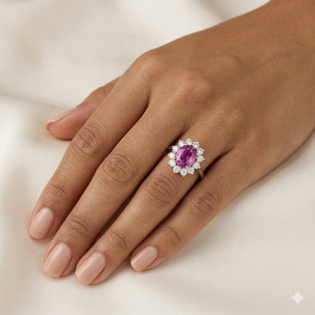 A brand-new, unused certified natural diamond and pink sapphire gemstone cluster ring that radiates sophistication and charm. Beautifully crafted in platinum, this exquisite piece features a captivating oval mixed-cut pink sapphire weighing 2.56 carats, displaying an alluring purplish-pink hue that embodies romance and elegance. Surrounding the sapphire is a dazzling halo of brilliant-cut natural diamonds, meticulously set to enhance its vibrant colour and brilliance. The diamonds, totalling 0.82 carats and graded H–I in colour with SI1 clarity, create a mesmerising contrast against the vivid centre stone, illuminating the design with breathtaking sparkle.
