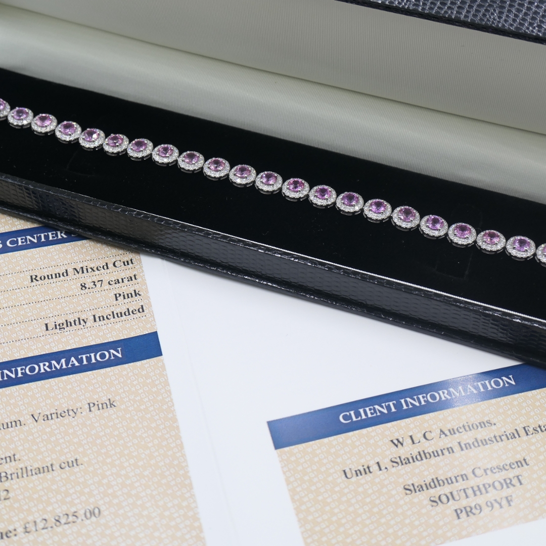 A brand-new, unused 9ct white gold bracelet set with a vibrant display of natural gemstones and diamonds, creating an elegant statement of colour and brilliance. The design features 23 round mixed-cut pink sapphires with a combined weight of 8.37ct, each displaying a striking pink hue that is both lively and romantic. Surrounding the sapphires are 322 round brilliant cut natural diamonds, weighing a total of 3.11ct, graded F–G for colour and SI1–SI2 for clarity, providing a dazzling contrast that enhances the beauty of the sapphires.
