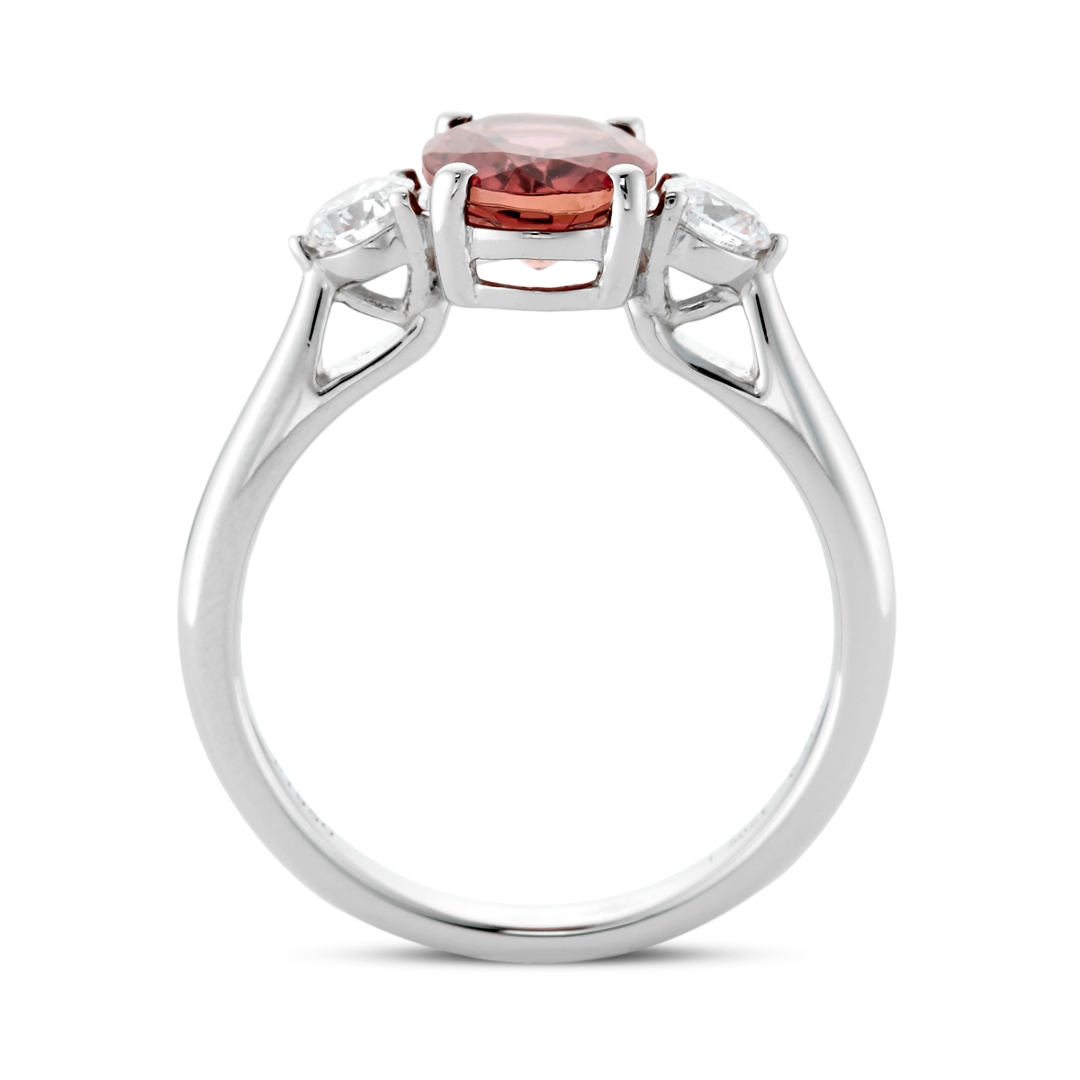 A brand-new, unused, certified natural diamond & pink tourmaline three-stone cluster ring, with one oval mixed-cut pink tourmaline gemstone to the centre & two brilliant-cut diamonds to the sides, set in platinum.