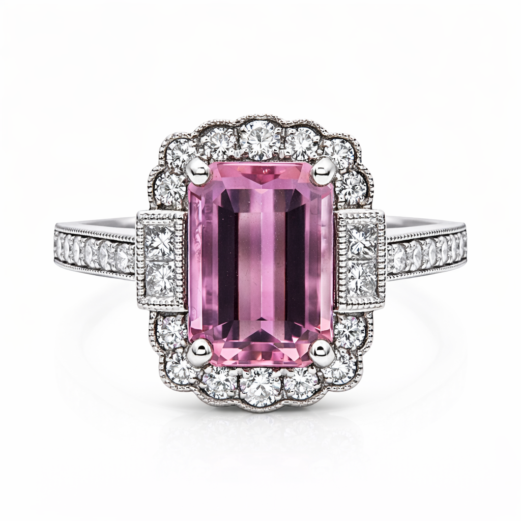 A brand-new, unused certified natural diamond and pink tourmaline flower-shaped cluster ring, finely crafted in platinum and designed to showcase an elegant balance of vivid colour and refined brilliance. At the centre of the design sits an emerald-cut pink tourmaline weighing 2.45 ct, displaying a lively, captivating pink tone that immediately attracts attention. The gemstone's clean, step-cut facets enhance its clarity and colour depth, creating a distinctive focal point that adds a sophisticated presence to the overall floral-inspired design.