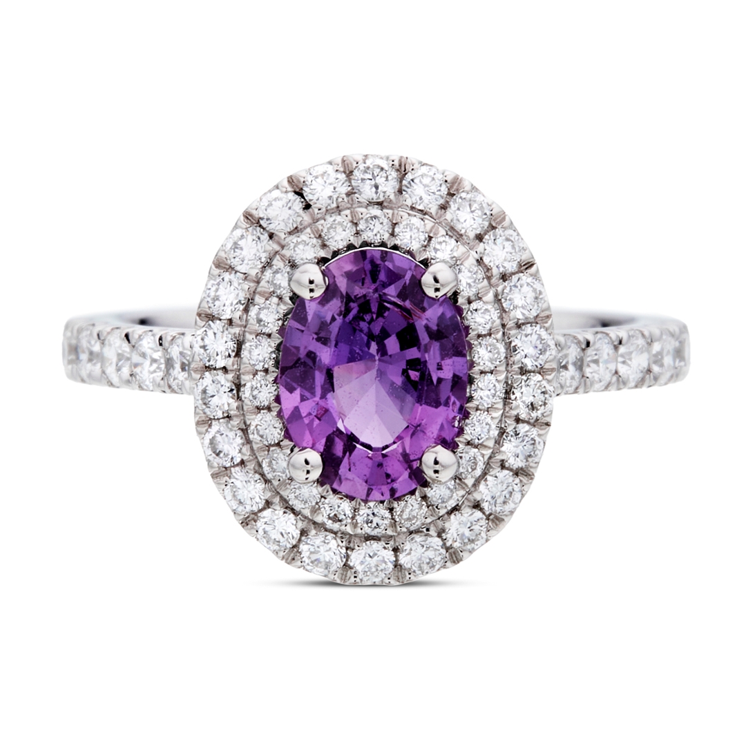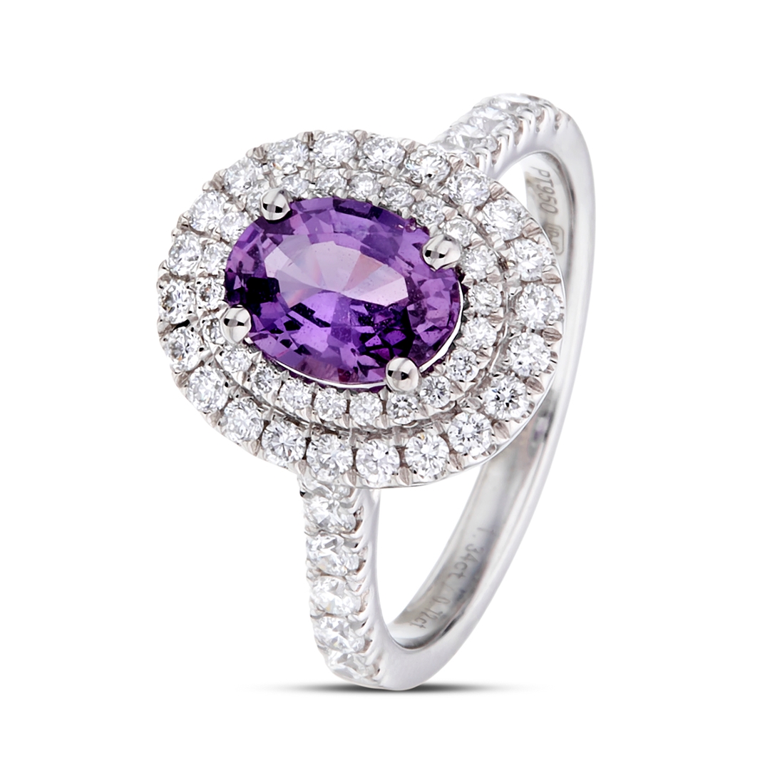 A brand-new, unused, certified natural diamond & purple sapphire oval-shaped cluster ring, set with one oval mixed-cut purple sapphire gemstone at the centre & a cluster of brilliant-cut diamonds in a double halo setting & to the shoulders, set in platinum.