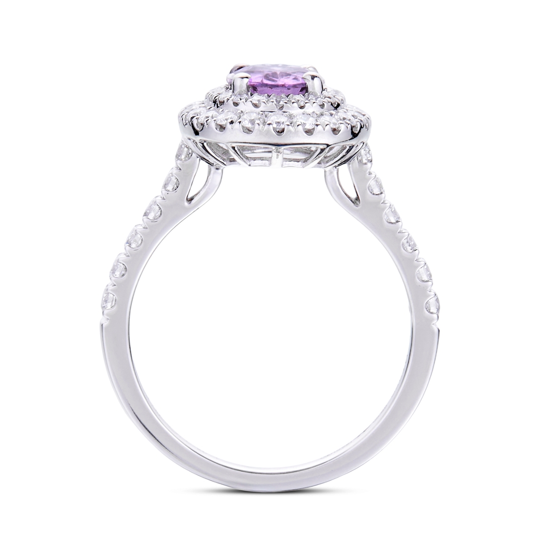 A brand-new, unused certified natural diamond and purple sapphire cluster ring that brings together rich colour, elegant design and enduring desirability. At its centre sits a 1.34ct oval mixed-cut purple sapphire displaying a refined, velvety purple tone that shifts beautifully in the light. The oval cut enhances the stone’s natural brilliance, giving it an elongated elegance and a graceful presence on the hand. Surrounding this striking centre stone is a double halo of natural brilliant-cut diamonds totalling 0.54ct in F–G colour and VS2–SI1 clarity, creating a shimmering frame that strengthens the sapphire’s depth of colour and enhances the ring’s overall radiance. Natural diamonds continue along the shoulders, adding movement and sparkle while highlighting the long-standing admiration collectors have for genuine, earth-formed diamonds, whose rarity and authenticity remain highly prized.