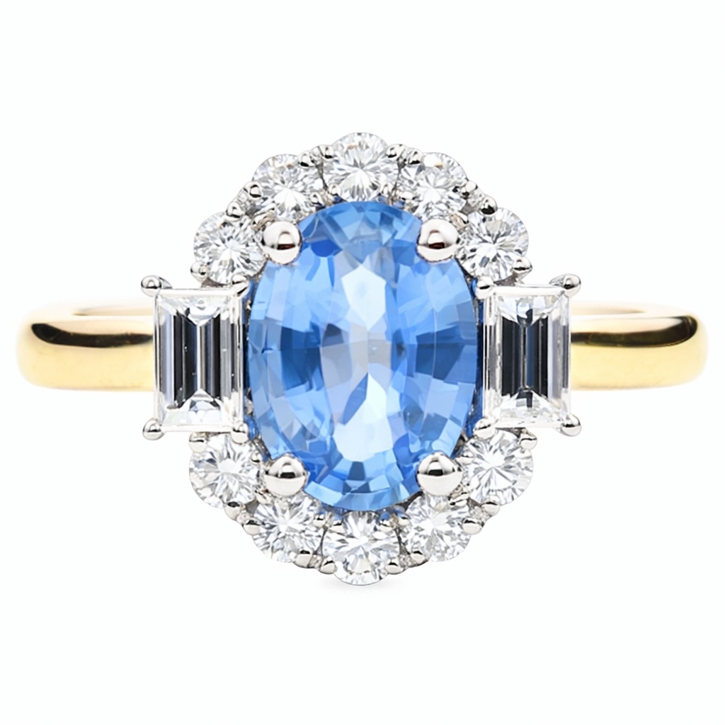 Two baguette-cut natural diamonds flank the centre stone, adding clean architectural lines that enhance the flower-shaped design. A surrounding halo of brilliant-cut natural diamonds completes the cluster and continues subtly to the shoulders, delivering refined sparkle and balance. The diamonds have a combined weight of 0.55 carats, chosen for their clarity, brightness, and ability to elevate the coloured gemstone without overpowering it.