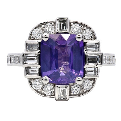 A brand-new, unused, certified natural diamond & purple sapphire cushion-shaped cluster ring, with one emerald-cut purple sapphire gemstone at the centre, a cluster of baguette-cut & brilliant-cut diamonds in a halo setting & a cluster of baguette-cut diamonds to the shoulders, set in platinum.