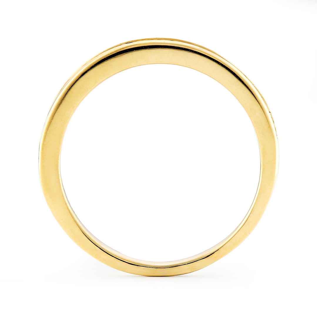 A brand-new, unused eternity ring crafted in certified 18ct yellow gold, this elegant piece is set with nine round mixed-cut natural rubies and eight brilliant-cut natural diamonds. The rubies, totalling 0.32ct, present a rich, striking red hue that pairs beautifully with the warm glow of the yellow gold band. The diamonds, totalling 0.19ct, are graded F–G in colour with SI1–SI2 clarity, ensuring a bright, lively sparkle that provides the perfect contrast to the rubies’ intensity. Together, the gemstones form a seamless design of elegance and timeless appeal.