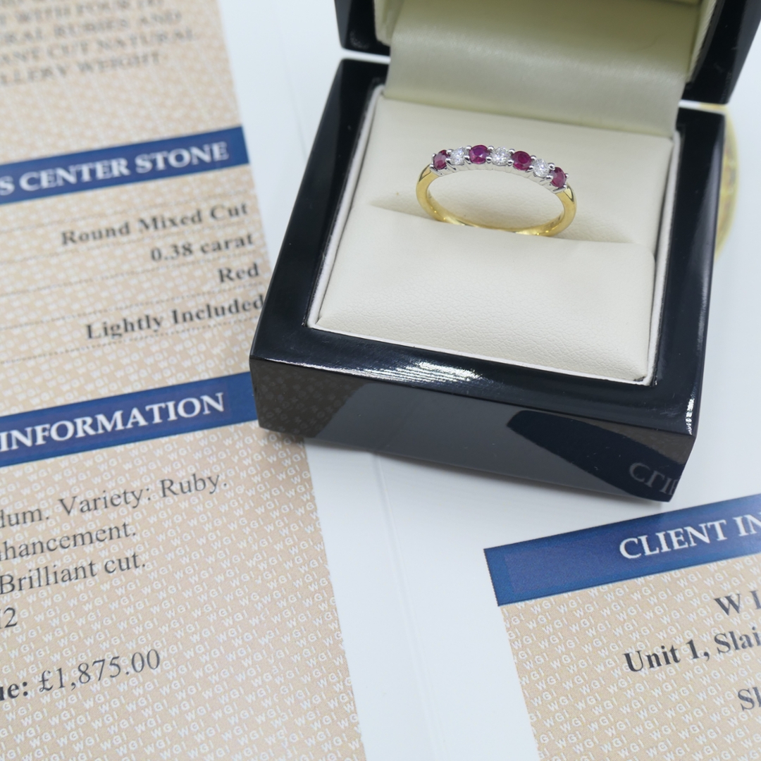 A brand-new, unused, certified natural diamond & ruby gemstone eternity ring, set with four round mixed-cut ruby gemstones & three brilliant-cut diamonds, set in 18ct yellow & white gold.
